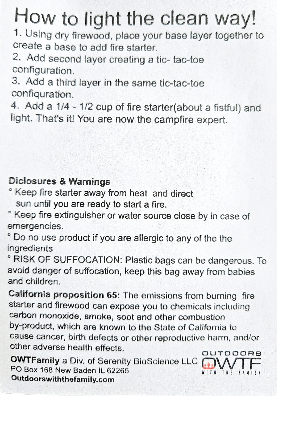 Experience the convenience and reliability of our exceptional fire starter – your perfect companion for outdoor adventures and emergency preparedness. With our fire starter, igniting a fire becomes effortless and efficient. Whether you're camping, hiking, or enjoying a cozy evening by the fireplace, our fire starter provides a consistent and powerful flame that quickly and easily ignites your fire. It's convenient and makes it easy to light your firepit, BBQ, or Woodstove. Don't be let down by non-effective starters – trust OWTF fire starter to ignite your fire in any situation. Try our Firestarter and get ready to spark unforgettable moments.